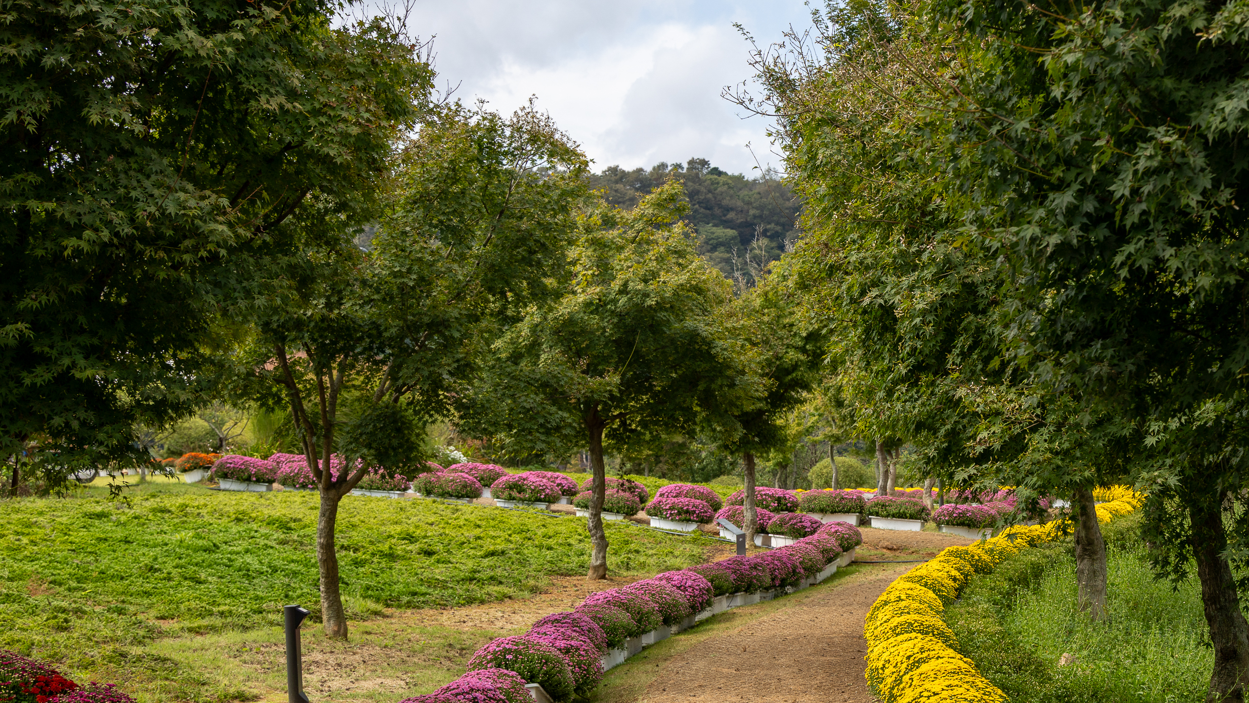 아름다운 꽃길이 길게 이어진 산책로를 따라 걸으면
