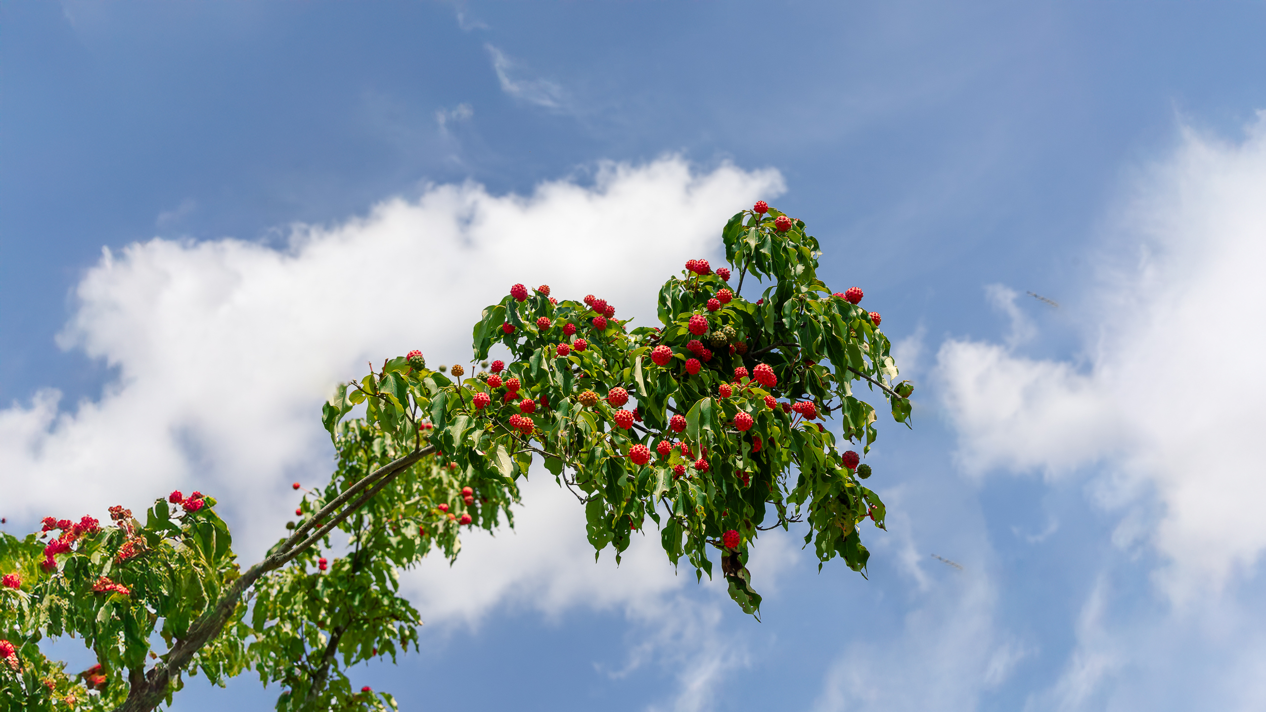 붉게 익은 산딸나무 열매는 생명의 활력을 보여주며,