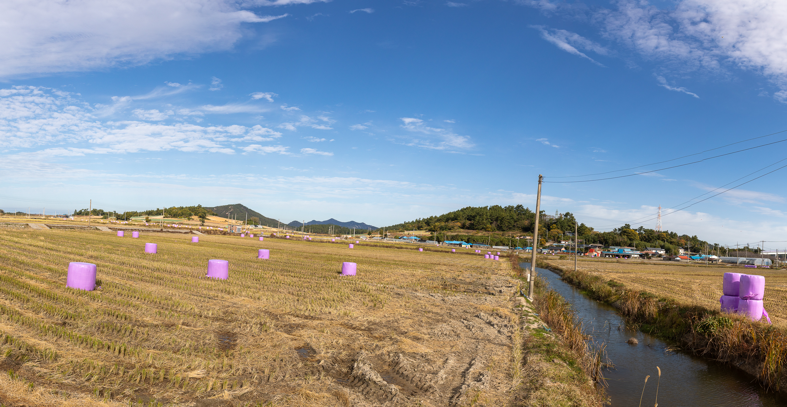 수확을 마친 논에는 볏단을 덮은 퍼플색 비닐이 눈에 띈다.