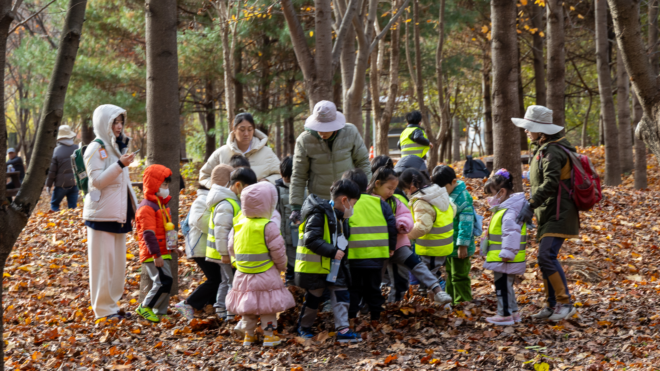 한 무리의 유치원 꼬마들이 낙엽을 밟으며