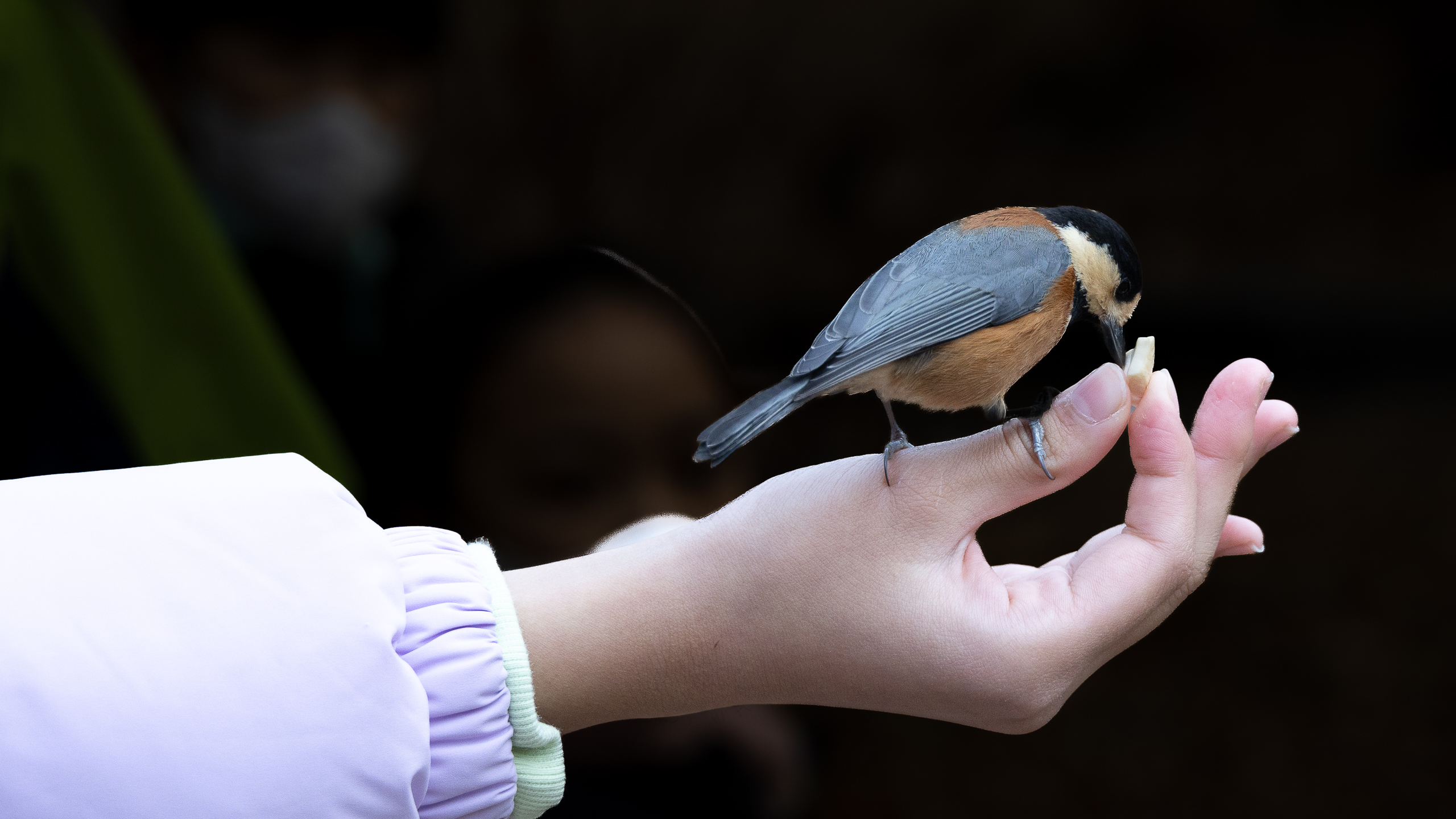 땅콩을 쥔 손바닥 위에 거침없이 내려앉는