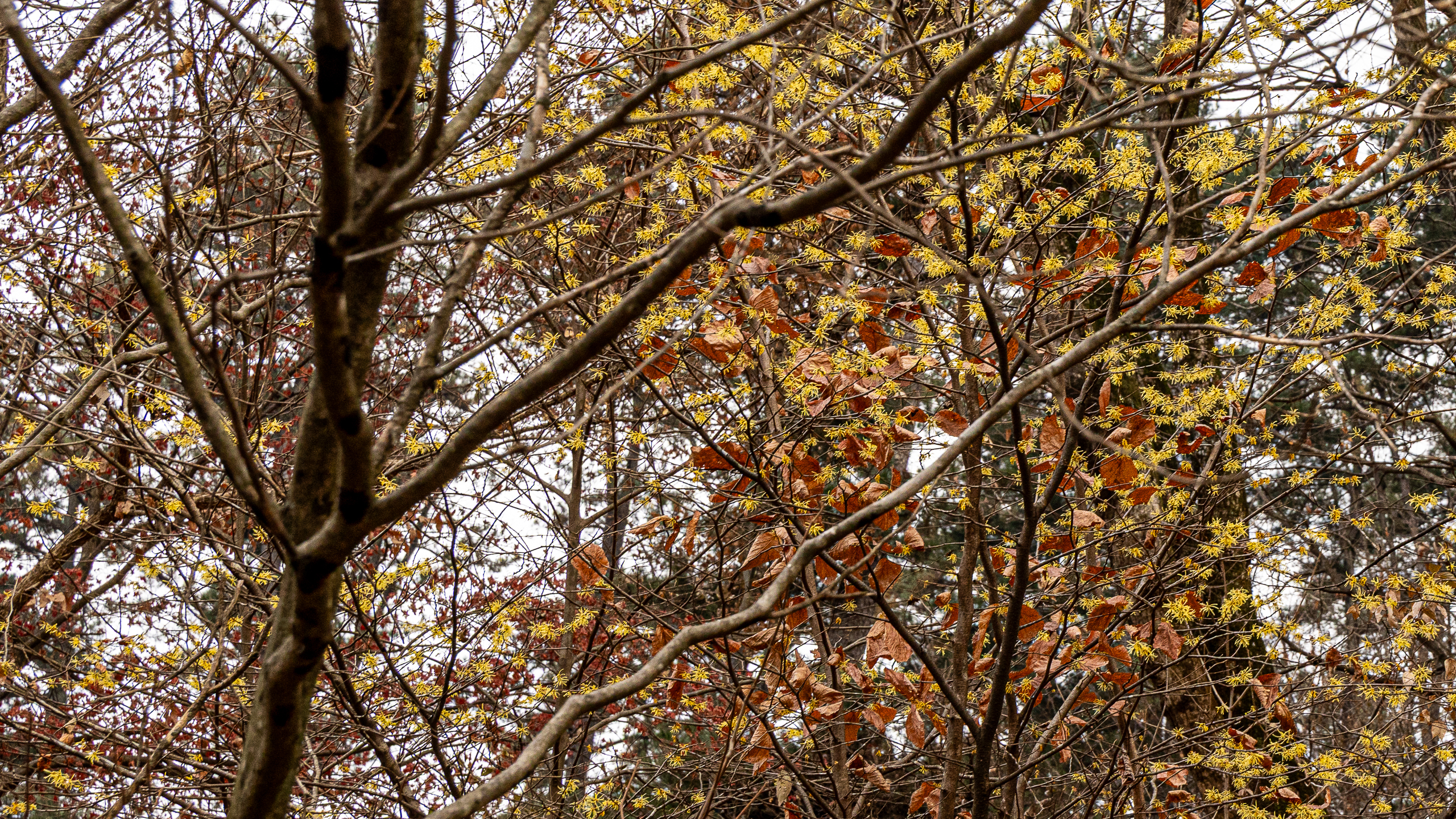 특이하게도 철을 잊은 풍년화 꽃이 수줍게 피어올라